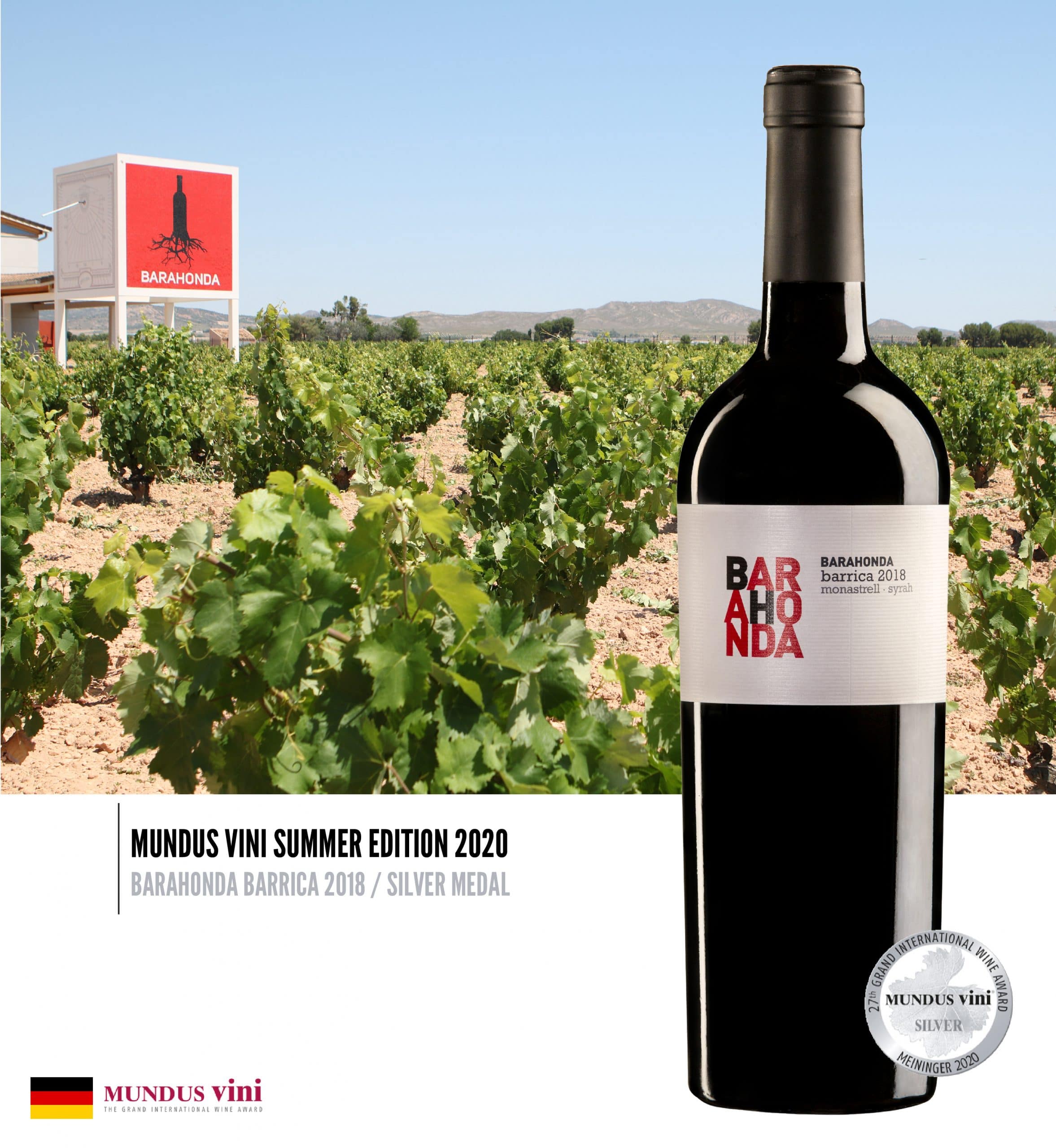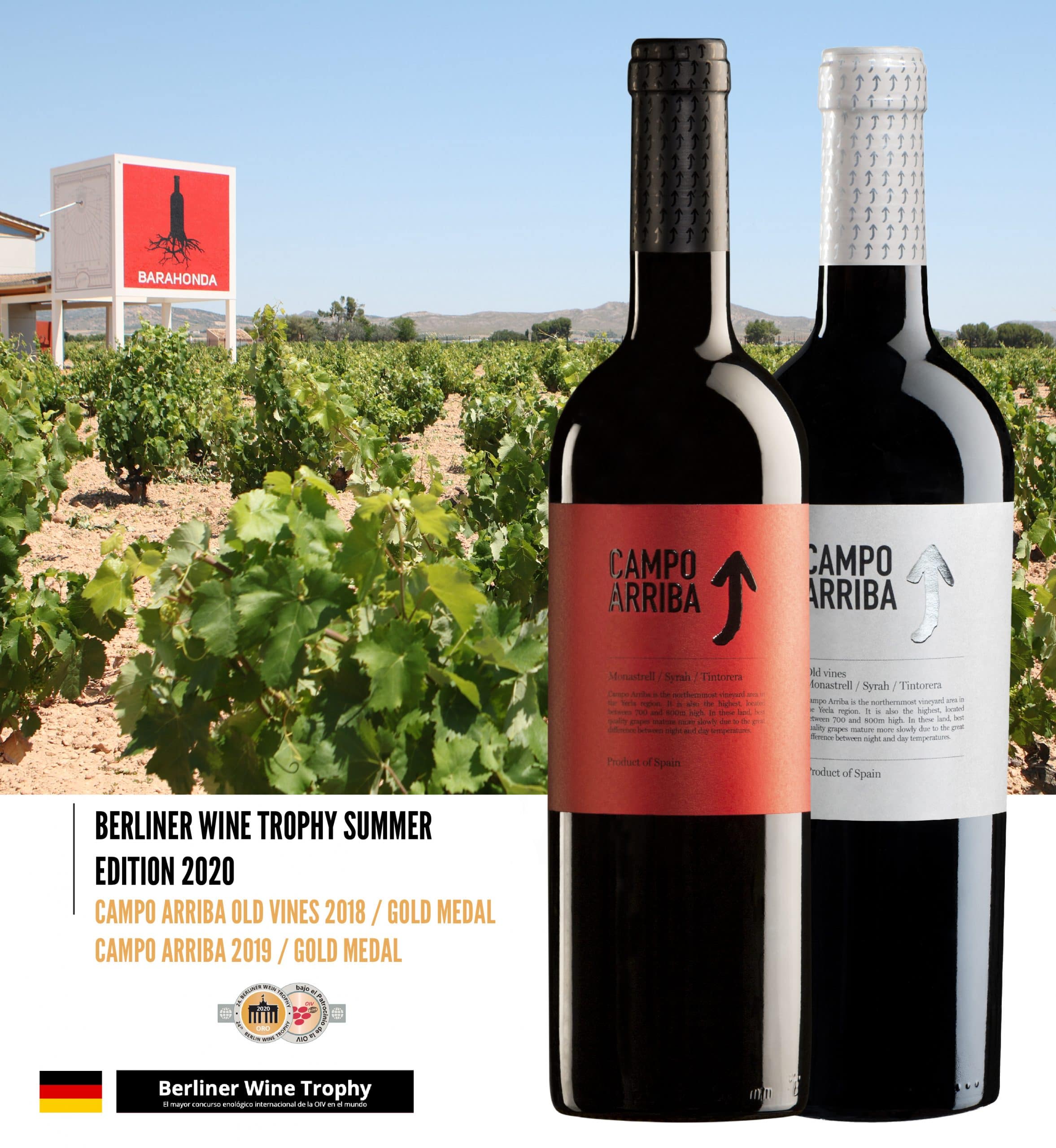 Yecla, 28 de septiembre 2020. Tres vinos de Barahonda han sido premiados en los certámenes de vino Berliner Wine Trophy y Mundus Vini, ambos celebrados en Alemania. Los vinos Campo Arriba Old Vines 2018 y Campo Arriba 2019 con sendas medallas de oro en Berliner Wine Trophy —edición verano— 2020 y Barahonda Barrica 2018 con medalla de plata en Mundus Vini Summer Edition 2020, certifi can el reconocimiento de los vinos de Barahonda a nivel internacional.
